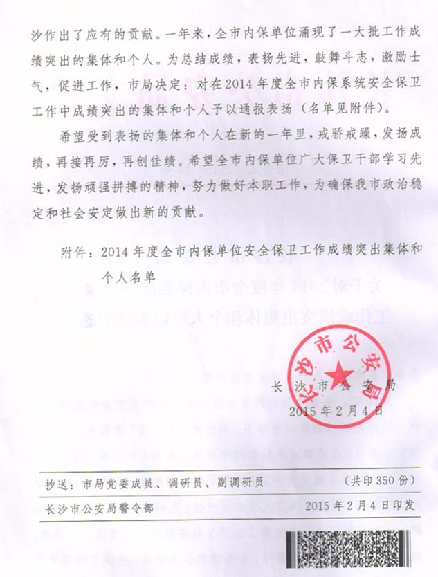 注:2014年因政府嚴(yán)控各類表彰活動,確需表彰的也僅發(fā)放文件,一律不再頒發(fā)各種獎牌。所以2014年長沙市公安局沒有發(fā)放獎狀。獎勵通報文件附后。